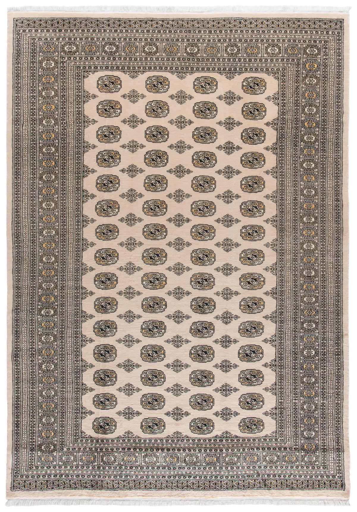 Läckra färgtoner och klassiska mönster utgör denna orientaliska matta "Bochara Premium" från ESPOSA. Mattan har ett mått på B/L ca. 150 x 200 cm och är handknuten i Pakistan av 100% ren ny ull. Den excellenta kvaliteten återspeglas i den mjuka ytan. En tidlös klassiker i crémefärg.
