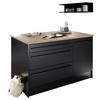 Bakom en lucka på den nedre nivån finns ytterligare ett förvaringsfack för kökstillbehör. Allt som du behöver ha snabbt till hands eller vill visa upp dekorativt kan förvaras i det öppna facket eller på vägghyllan. Det perfekta komplementet till din köksinredning: en ca 145 cm bred köksö i färgerna antracit och ek som på ett harmoniskt sätt kompletterar ditt kök!
